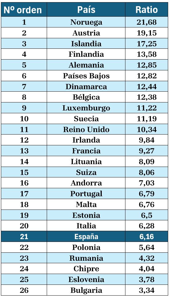 Por debajo de España sólo aparecen Polonia, Rumania, Chipre, Eslovenia y Bulgaria. Mientras que a la cabeza de Europa están Noruega, Austria, Islandia, Finlandia o Alemania.